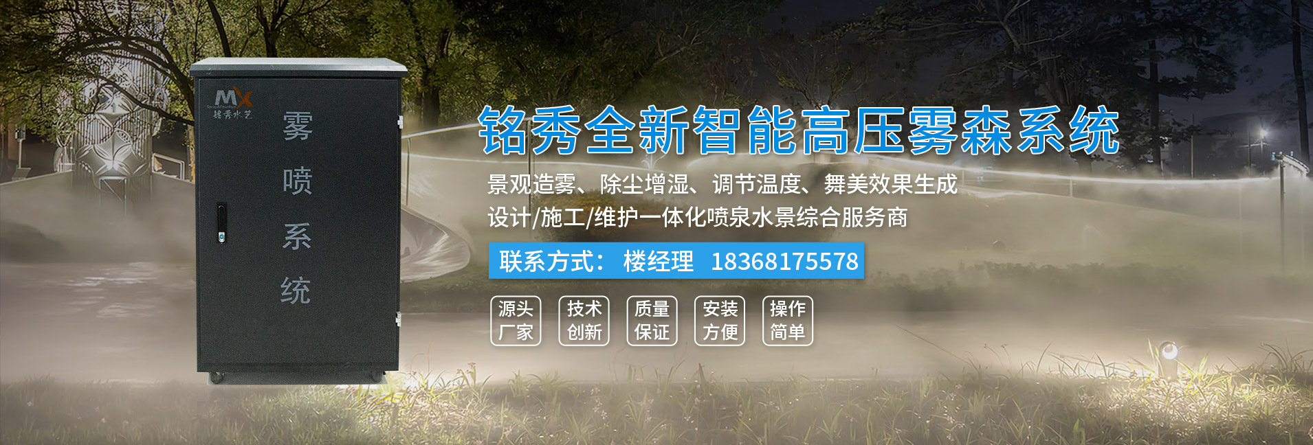 杭州銘秀水藝水景設備有限公司位于杭州余杭鳳都工業園區內,是一家專業從事噴霧(霧森)設備、冷霧設備、噴泉設備集各種新型水景設備生產、銷售與租賃的企業。 公司技術力量雄厚,機械加工設備齊全,并擁有一支經驗豐富的設備研發隊伍和一套完善的售后服務系統。